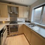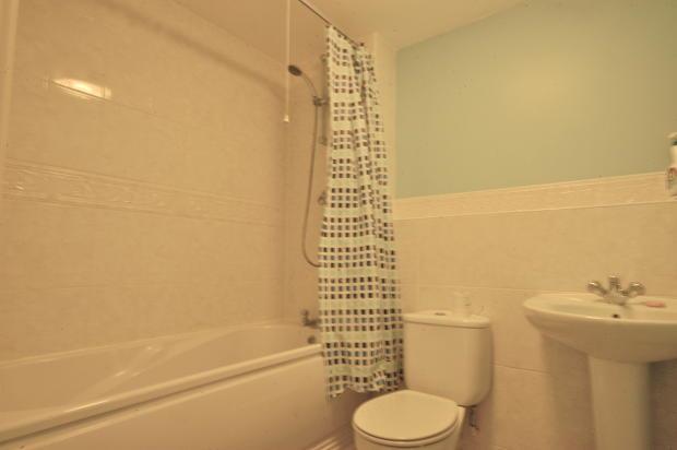 The accommodation comprises a generous open-plan living and dining area leading into a well-appointed kitchen with integrated appliances. There are two double bedrooms, the principal bedroom benefiting from a large built-in wardrobe, along with a modern bathroom featuring a shower over the bath.